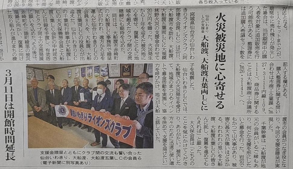 内 容: 大船渡森林火災から一年になる節目に、今期各アクティビティを通して大船渡森林火災復興支援金の募金活動を行い集まった募金を、大船渡ライオンズクラブ・大船渡五葉ライオンズクラブに贈呈させていただき、現地復興支援の一助となりますよう託してまいりました。贈呈後、被災した半島を視察し、延焼範囲の広大と火災の恐ろしさを痛感してまいりました。